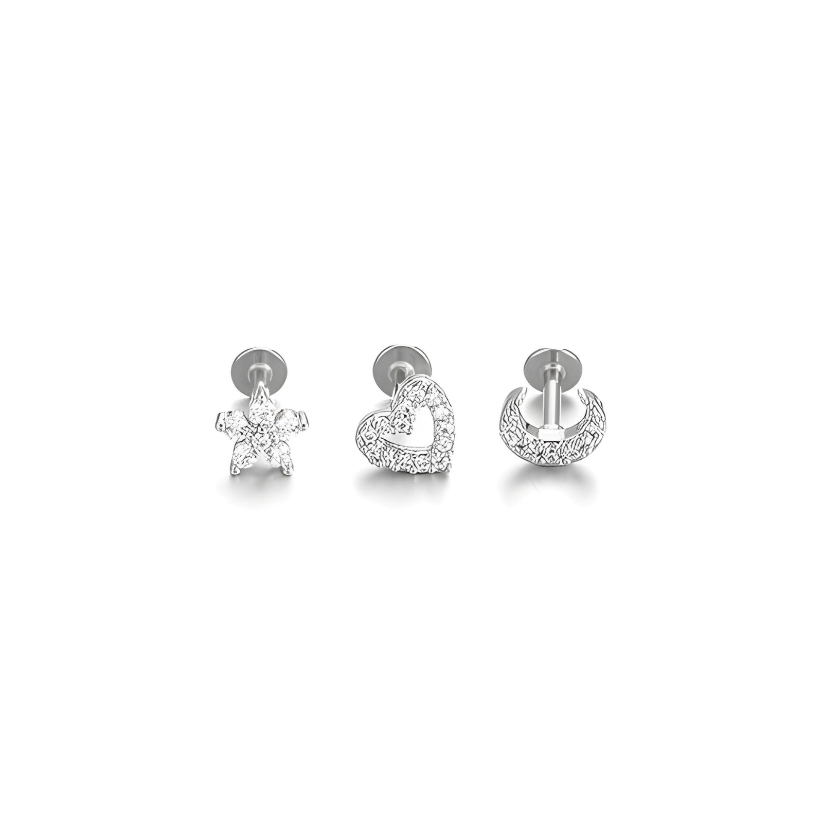 Il set include tutti e tre i piercing, venduti insieme e non in coppia. Tre punti di luce che risplendono insieme, simbolo di armonia e connessione. Per chi ama uno stile unico e moderno.